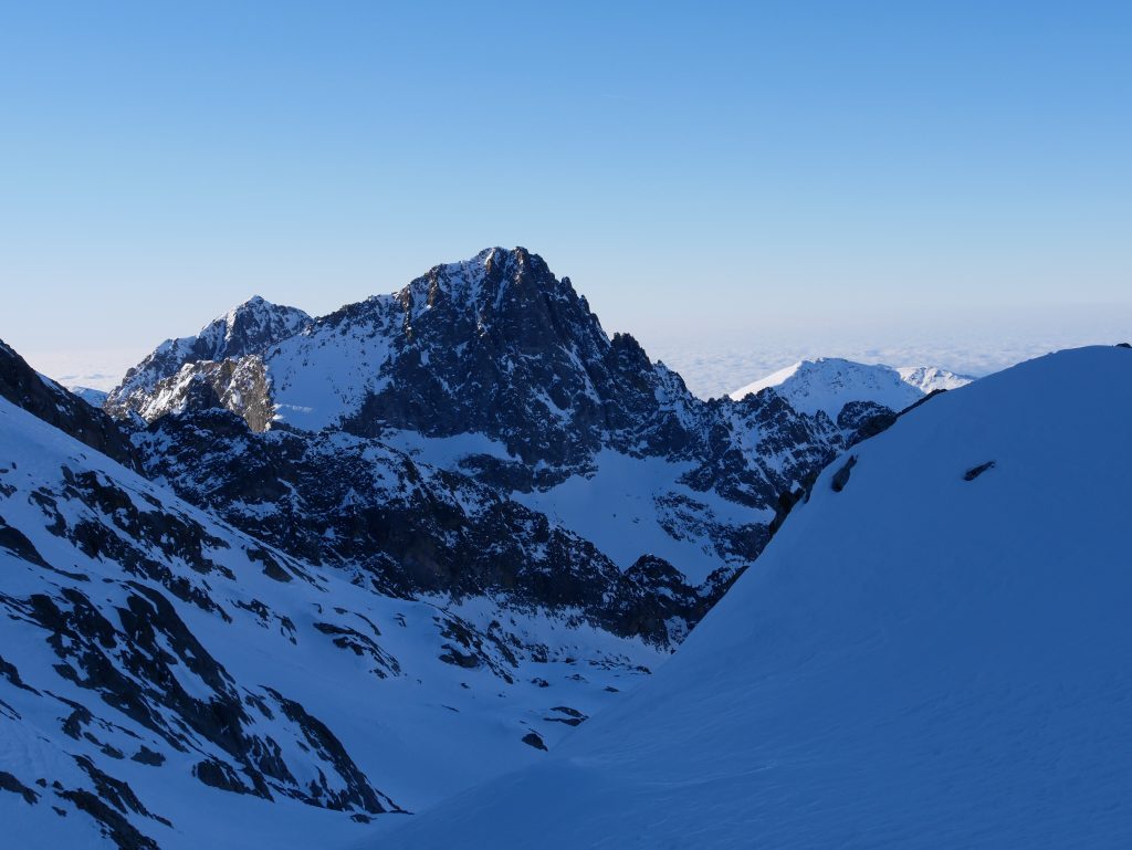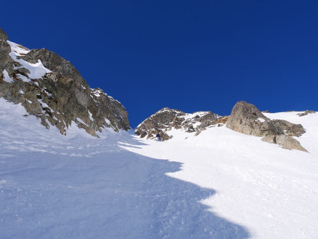 Le soleil nous rejoint pour la dernière partie de l’ascension. Le couloir Est du Gelas est déjà baigné de lumière et semble en conditions parfaites.
