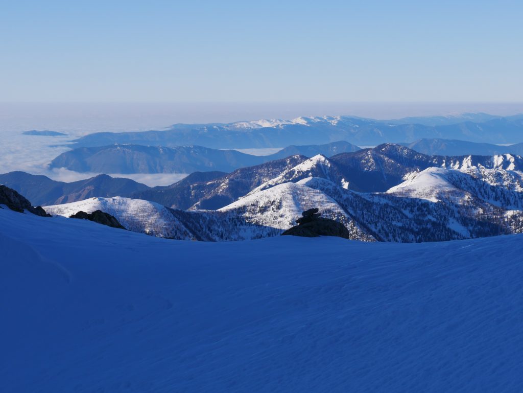 Nous le remontons en une trentaine de minutes et atteignons le sommet du Gelas à 3143m point culminant du massif du Mercantour. La Vierge disparaît sous une impressionnante quantité de neige. Tout l’arc alpin s’ouvre devant nous, offrant une vue à 360°, avec toujours la Corse qui se devine au loin.