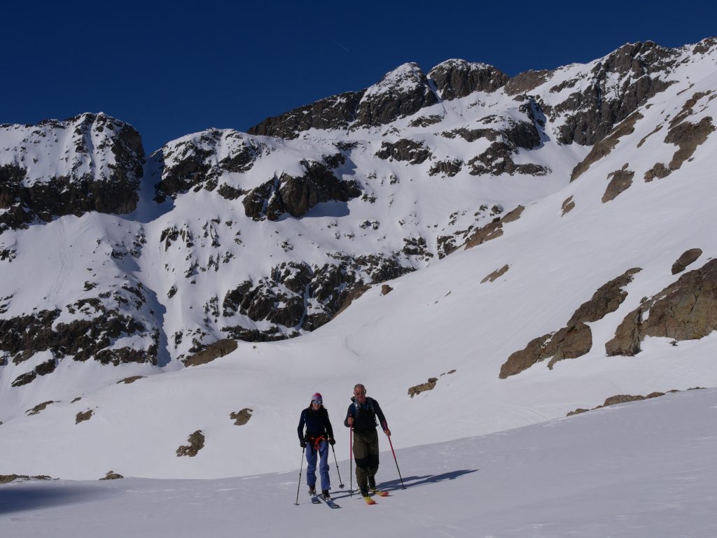 Vient ensuite le moment de remettre les peaux pour rejoindre le col et basculer de nouveau côté français. Le timing est idéal et nous remontons le vallon à l’ombre du Gélas. Quel bonheur ! Je me souviens d’une sortie, il y a bien longtemps, où nous avions remonté ce même vallon sous un soleil de plomb, skis aux pieds…