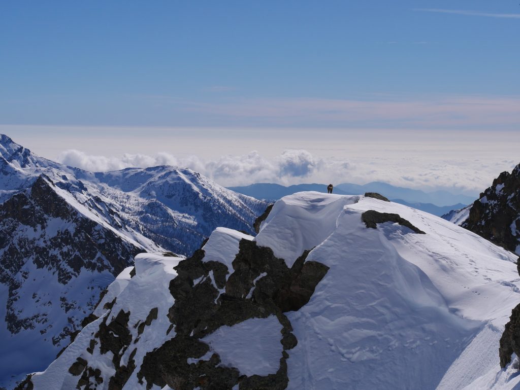 À 9 heures, nous atteignons le sommet de la Cime de l’Agnel, la vue de la haut est époustouflante.. Quelques minutes plus tard, nous plongeons dans les pentes est. La neige y est parfaite : un vrai bonheur à skier.